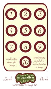 Irregardless Café, a fixture in the Raleigh restaurant community since 1975, has recently started offering Punch cards for lunch patrons! For every 5 lunches worth $10 or more, you get a free dessert. After 10 lunches, you can redeem the card for a free lunch entree!
