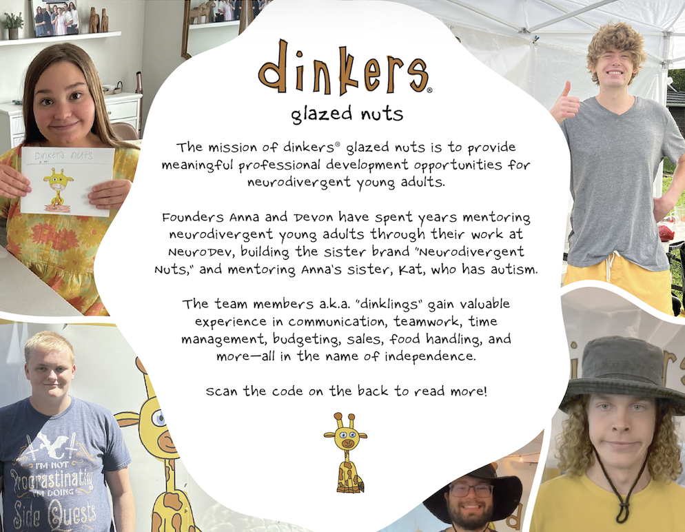 The mission of dinkers® glazed nuts is to provide meaningful professional development opportunities to neurodivergent young adults. Founders Anna and...