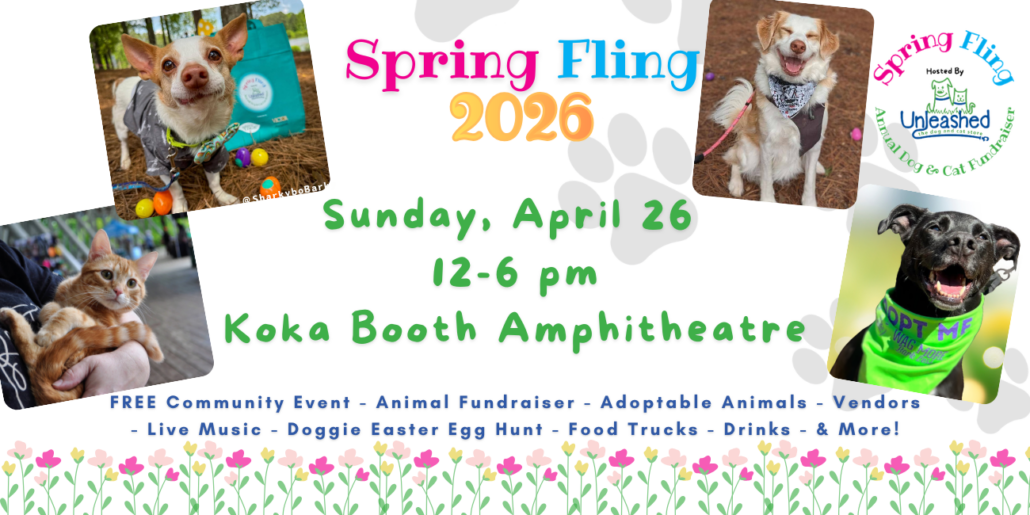 Join us at Unleashed’s 13th Annual Spring Fling Dog & Cat Fundraiser – the Triangles biggest pet-friendly event! Browse local vendors with a wide assortment of products and services for people and pets. Meet dogs and cats from 40 local area rescue groups and learn how to volunteer, foster, adopt, donate, or just get your fill of puppy love. Bring your dog (or any pet!) to participate in the largest Doggie Easter Egg Hunt in the country, where they can find eggs stuffed with prizes of all sizes, including up to one year of free pet food from Unleashed! Dogs can also try out an agility course, meet new friends, and enjoy many special snacks and goodies, including free treats from our amazing sponsors! If you have any items to donate, new or used, bring them to Spring Fling and they will go to the attending rescues. Come Celebrate with us on Sunday, April 26th, from 12:00 PM – 6:00 PM at Koka Booth Amphitheatre.