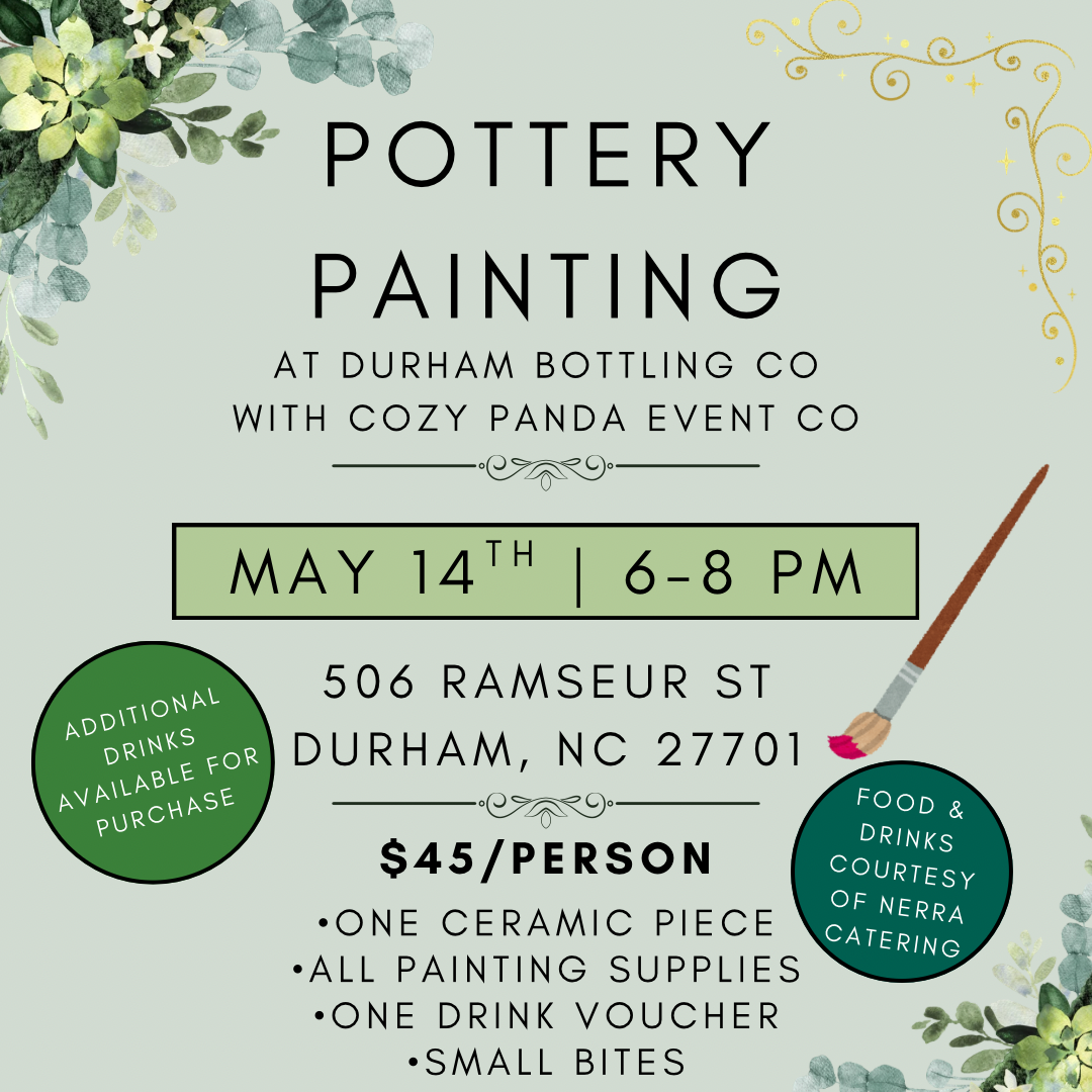 Don’t forget that we’re partnering with Durham Bottling Co and Nerra Catering to bring you an extra special workshop! Each ticket comes with a drink voucher and small bites to enjoy while painting.