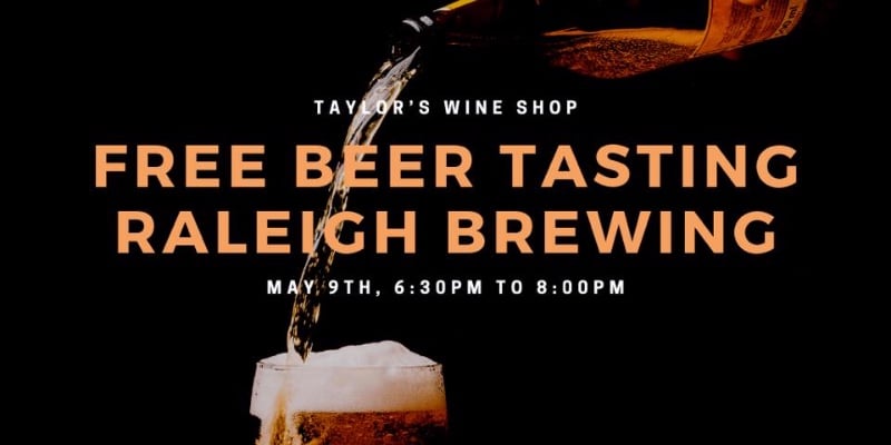 We love local and we love craft beer, so what better way to enjoy two things we love, than a free craft beer tasting with a local brewery, Raleigh Brewing! Come taste their latest brews with us on Thursday May 9th from 6:30pm to 8pm at Taylor’s Wine Shop!