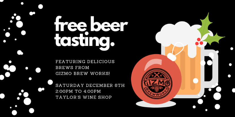 Whose ready to taste some free beer! We have a free beer tasting planned for Saturday, December 8th from 2pm until 4pmat Taylor’s Wine Shop featuring one of our favorites… Gizmo Brew Works!