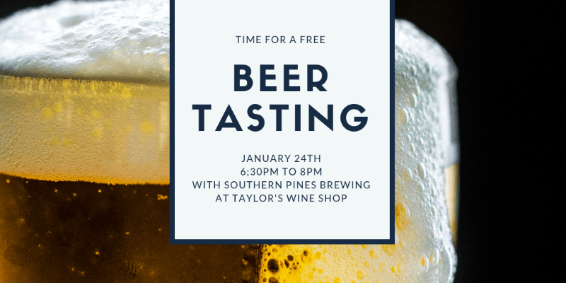 Join us for a free beer tasting featuring Southern Pines Brewing on January 24th from 6:30pm to 8:00pmat Taylor’s Wine Shop!