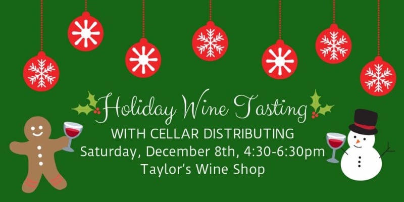 Join us for a special Saturday free Holiday Wine Tasting with Cellar Distributing on Saturday, December 8th from 4:30 to 6:30 PM at Taylor’s Wine Shop!