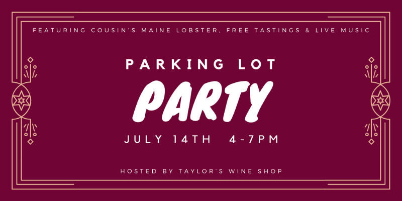 Come hang out with us on Saturday July 14th, 4-7pm for a Parking Lot Party at Taylor’s Wine Shop featuring Cousins Maine Lobster truck, Not Just Icing dessert truck, Live Music with The George Fuller Band, vendors including Norm’s Farms, CocoPods and Larry’s Coffee! Plus, Free Wine & Beer Tastings too!