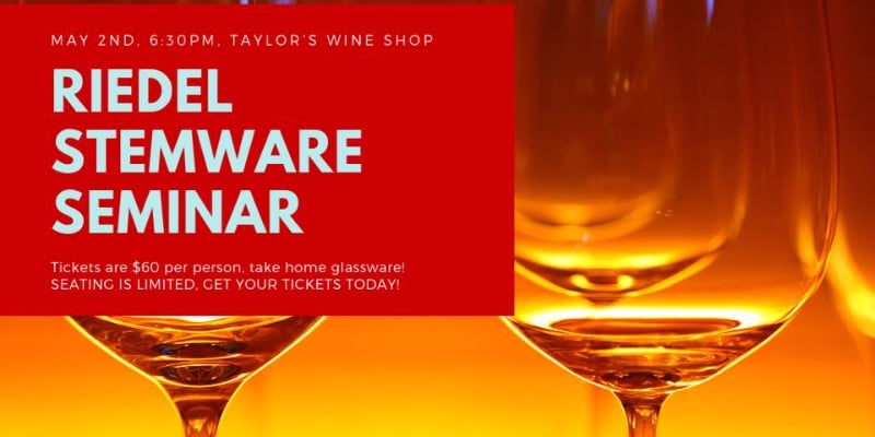 Riedel Stemware Seminar on May 2nd, 6:30pm Taylor’s Wine Shop: