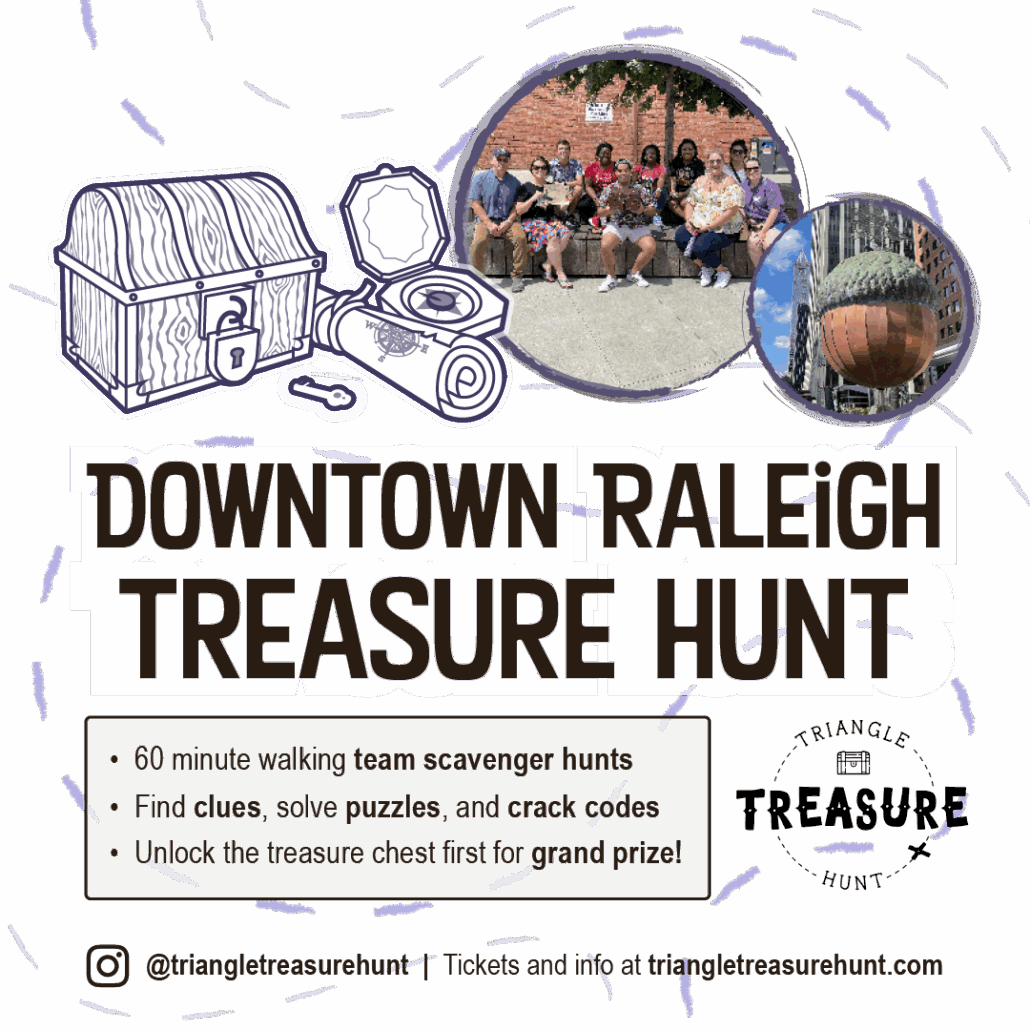 Guests will meet at Sir Walter Coffee (145 E. Davie St., Raleigh, NC 27601) and then depart with their treasure map on a walking team scavenger hunt where they will use their minds and feet to follow clues, solve puzzles, and crack codes to find and unlock the treasure chest for a grand prize!