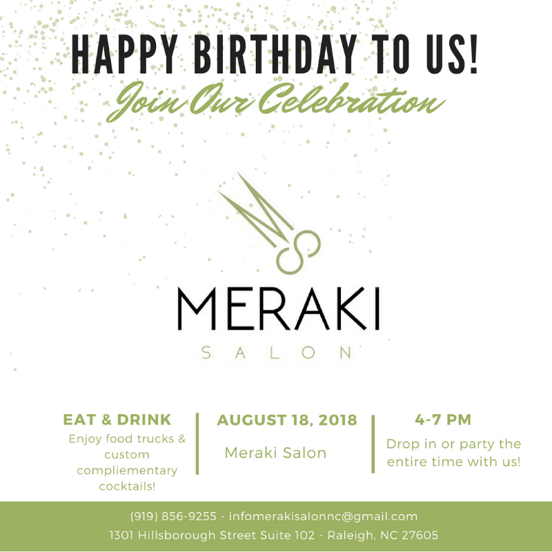 Join the celebration August 18 from 4-7pm at Meraki Salon on Hillsborough Street. Enjoy food trucks and custom complimentary cocktails. Drop in or stay for the whole celebration! Find more info on Meraki’s Facebook page.