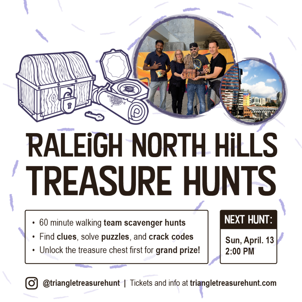 Join Triangle Treasure Hunt for a North Hills Walking Team Scavenger Hunt! Guests will meet at the fountain outside Yard House at the corner of Front at North Hills St. and Park at North Hills St. and then depart with their treasure map on a walking team scavenger hunt where they will use their minds and feet to follow clues, solve puzzles, and crack codes to find and unlock the treasure chest for a grand prize!
