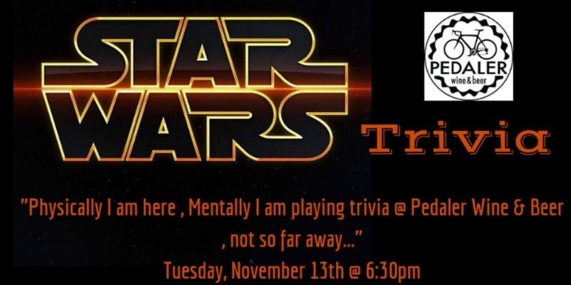 “Hmm! Adventure. Hmmpf! Excitement. A Jedi craves not these things.” Come to Star Wars Trivia (Episodes 1-7 & Rogue One) at Pedaler Wine & Beer on Tuesday, November 13th starting 6:30pm.