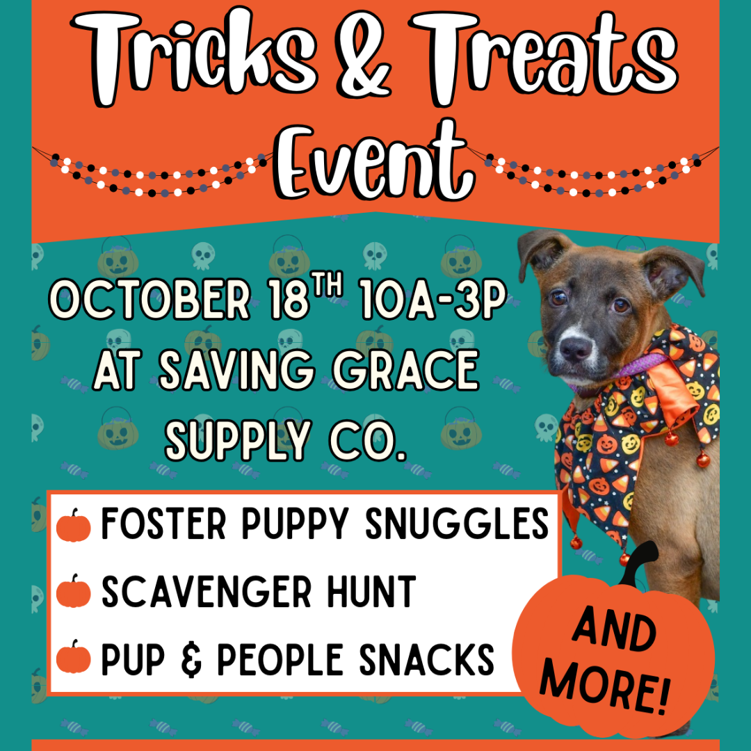 Join us at Saving Grace Supply Co. on Saturday, October 18th from 10am-3pm for our ‘Tricks & Treats’ Pawty!