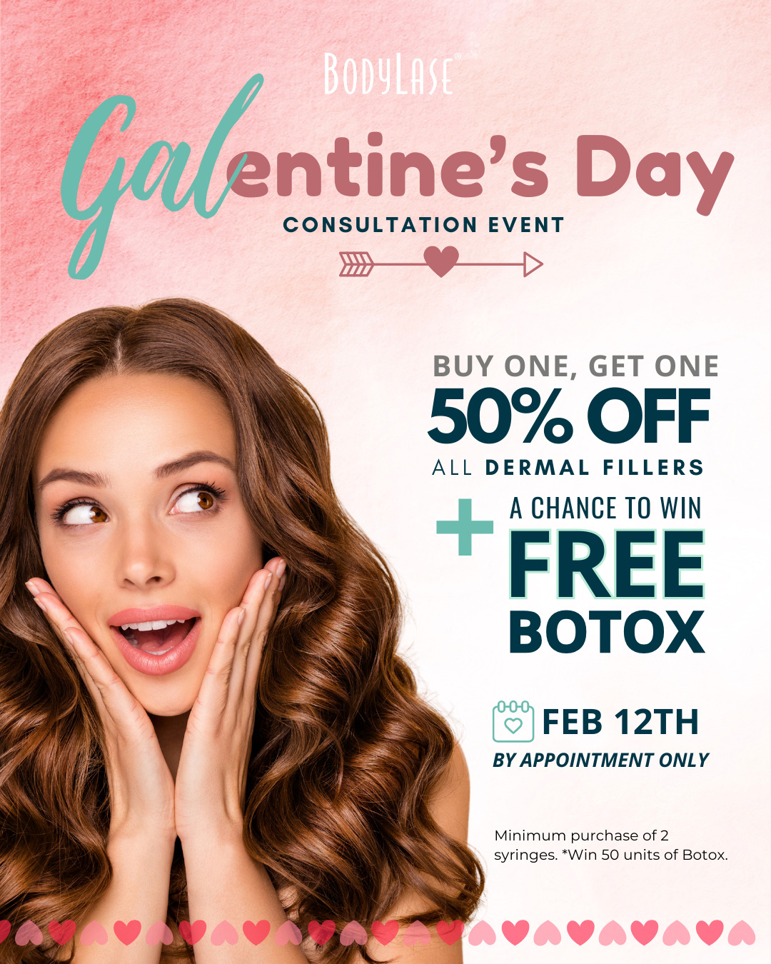 Feb 12: Galentine’s Day Consultation Event – RSVP for BOGO 50% OFF dermal fillers & a chance to win 50 FREE units of Botox!