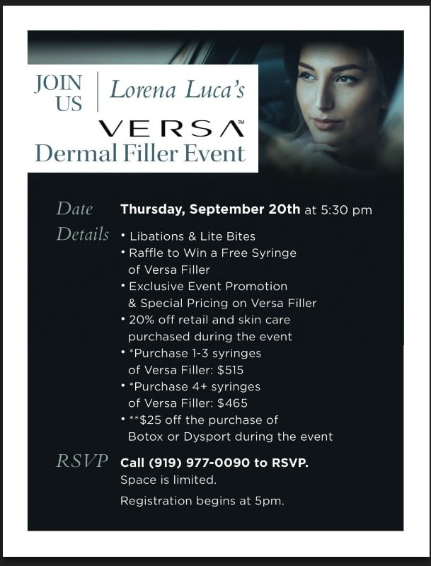 Libations & Lite Bites! Live Demos! Enter to win a FREE Syringe of VERSA Filler ($650 value)!