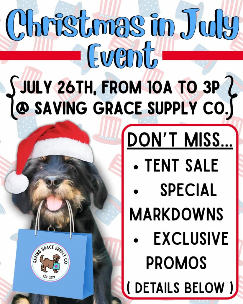 Beat the heat with some holly-jolly deals at Saving Grace’s “Christmas in July” event! Check out our Tent Sale for sizzling summer savings, special markdowns, and exclusive promos that’ll make your tail wag. Whether you’re shopping for your pet or a fellow animal lover, it’s the perfect time to stock up on gifts, gear, and goodies while helping shelter dogs. Don’t miss out—this sale only comes once a year (twice, if you’re lucky)!