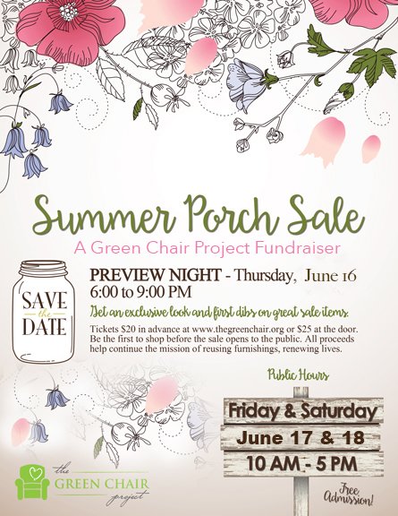 The Green Chair Project is a local nonprofit that reuses donated home furnishings to help families who have transitioned from homelessness, crisis or disaster. TGCPs Summer Porch Sale will be open to the public with free admission on Friday, June 17 and Saturday, June 18th. There will be NEW merchandise from local stores and designers and one-of-a-kind items perfect for your home! All proceeds from the sale support our mission on reusing furnishings, renewing lives.