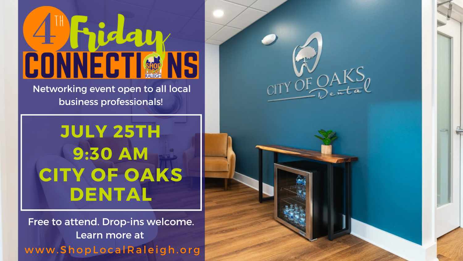 Meet us at City of Oaks Dental on July 25 for a morning of conversation and fun. We will tour their space and learn about their offerings before having time to mingle over coffee!