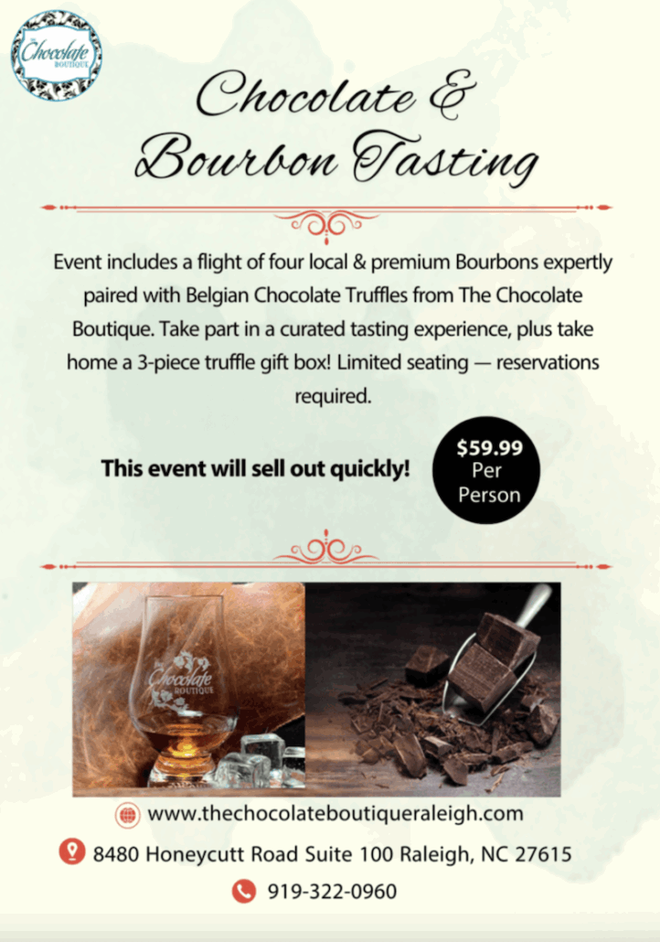 If you missed last month’s event, now’s your chance to join The Chocolate Boutique for another evening of indulgence with a chocolate and bourbon tasting. It’s the perfect way to unwind, discover new flavors, and treat yourself midweek.