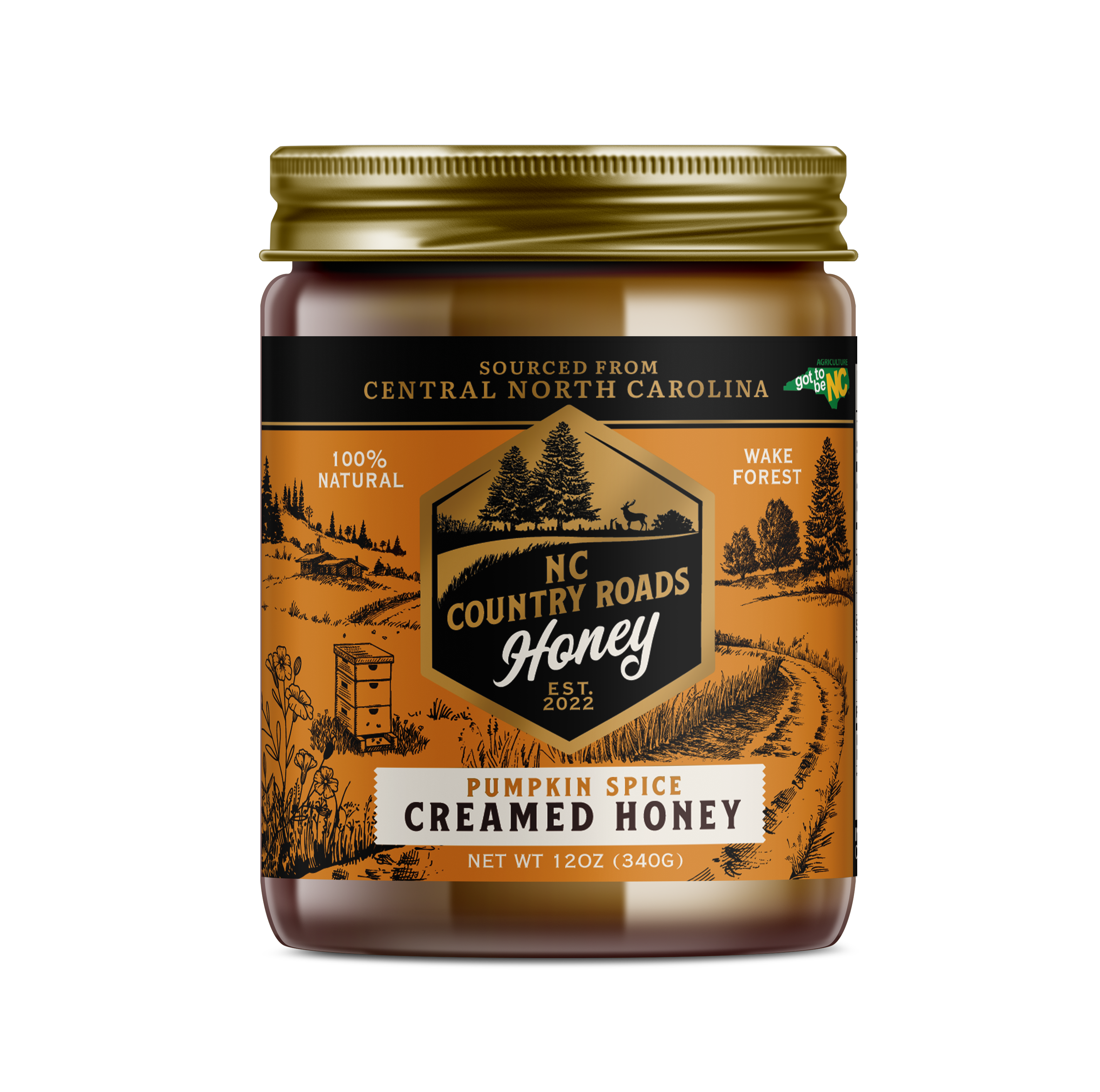 Pumpkin Spice creamed honey is made with honey from Central North Carolina and ground cinnamon, ginger, nutmeg, and cloves. Excellent on toast, pancakes, waffles, in your oatmeal, in your morning coffee/tea, on sweet potatoes, apples, bananas, pears, bagels, muffins, croissants, and more!